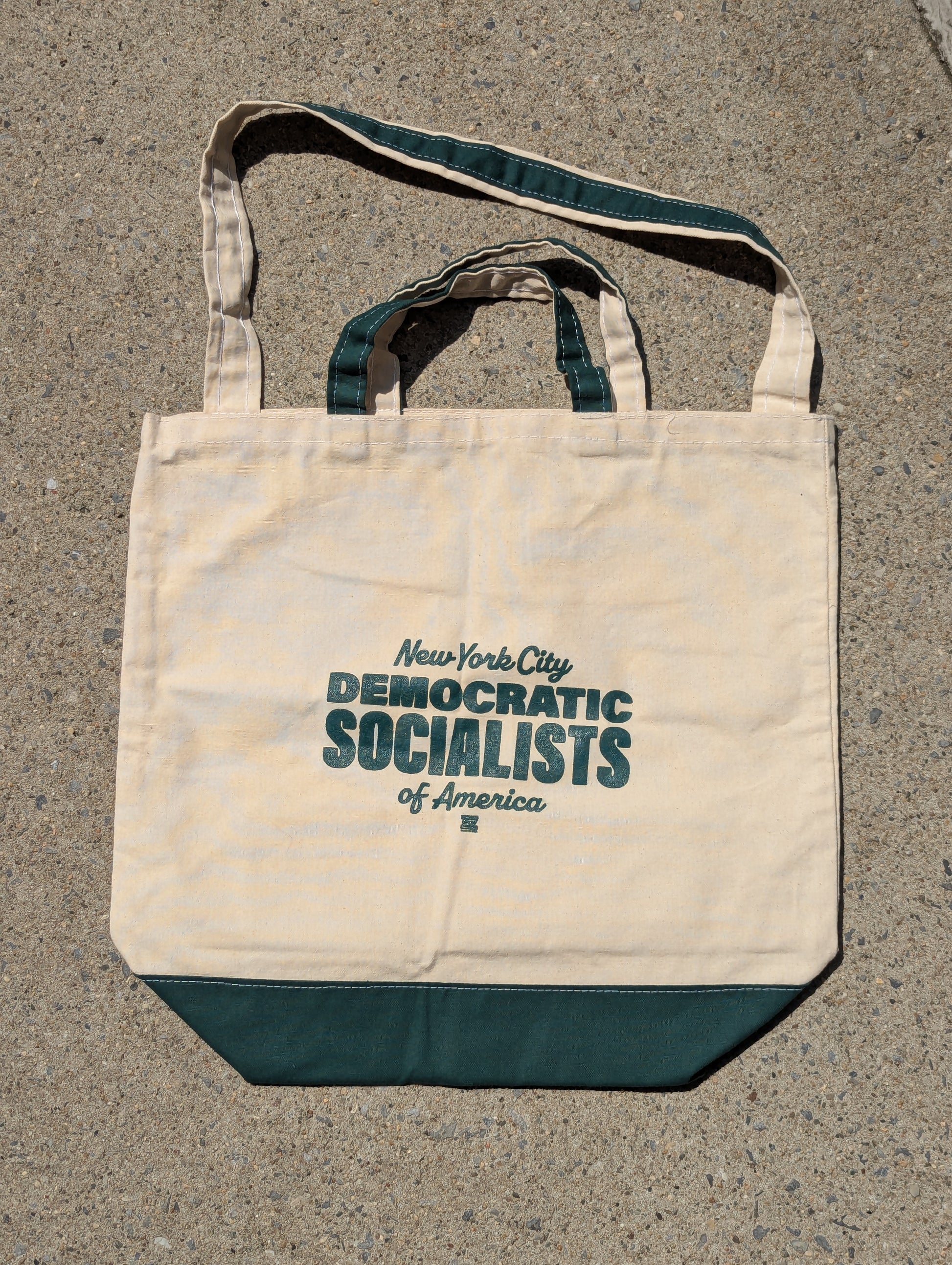 - Natural/beige tote has green accents and logo